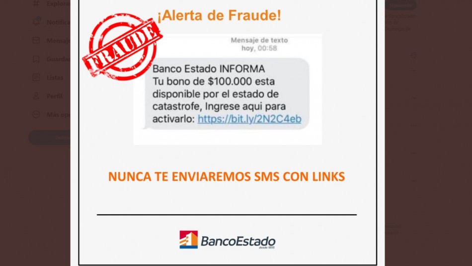 BancoEstado informó sobre una nueva estafa, en la cual a través de un mensaje se le indica a la persona que ingrese a un link fraudulento para recibir un bono de $100 mil por el contexto de estado de catástrofe. A través de su cuenta de Twitter, la entidad compartió el pantallazo del falso mensaje… Seguir leyendo Ofrecen bono de $100 mil: BancoEstado advierte sobre nueva estafa a través de mensaje de texto